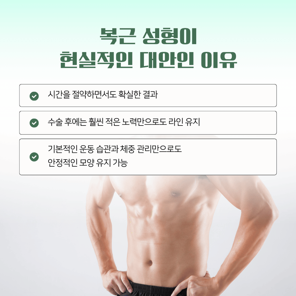 복근 성형은 단순한 미용 목적을 넘어, 현실적인 한계를 보완해주는 맞춤형 솔루션입니다.