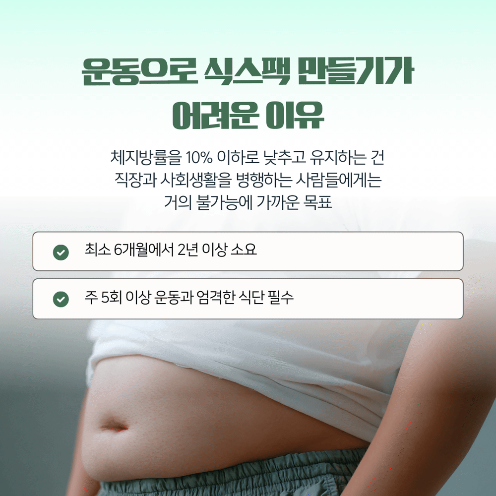 특히 체지방률을 10% 이하로 낮추고 유지하는 건, 직장과 사회생활을 병행하는 현대인에게 거의 불가능에 가까운 목표일 수 있습니다.